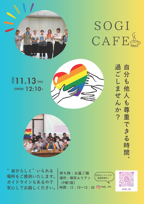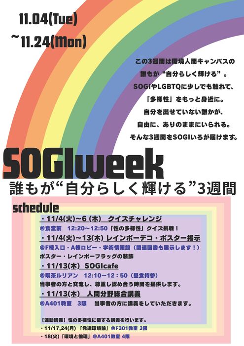 環境人間が学部では、性的マイノリティ(LGBTQ+)をはじめとする多様な性のあり方について理解を深め、誰もが自分らしく学び、働き、生活できるキャンパスづくりをめざして、「SOGI Week(ソジ・ウィーク)」を開催します。SOGIとは Sexual Orientation and Gender Identity(性的指向と性自認)のことで、人が「どのように人を好きになるか」「自分をどのような性として認識するか」を含む、とても身近な人間のあり方を示す言葉です。